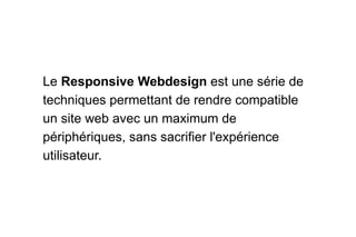 Le responsive webdesign utilise des techniques pour adapter un site web sur divers périphériques sans compromettre l'expérience utilisateur. Avec l'augmentation des visites sur smartphones, cette approche offre plusieurs avantages, notamment une gestion centralisée et une conformité avec les recommandations de Google et du W3C. La collaboration entre graphistes et intégrateurs est essentielle pour concevoir des sites qui s'ajustent visuellement tout en garantissant un accès optimal au contenu.