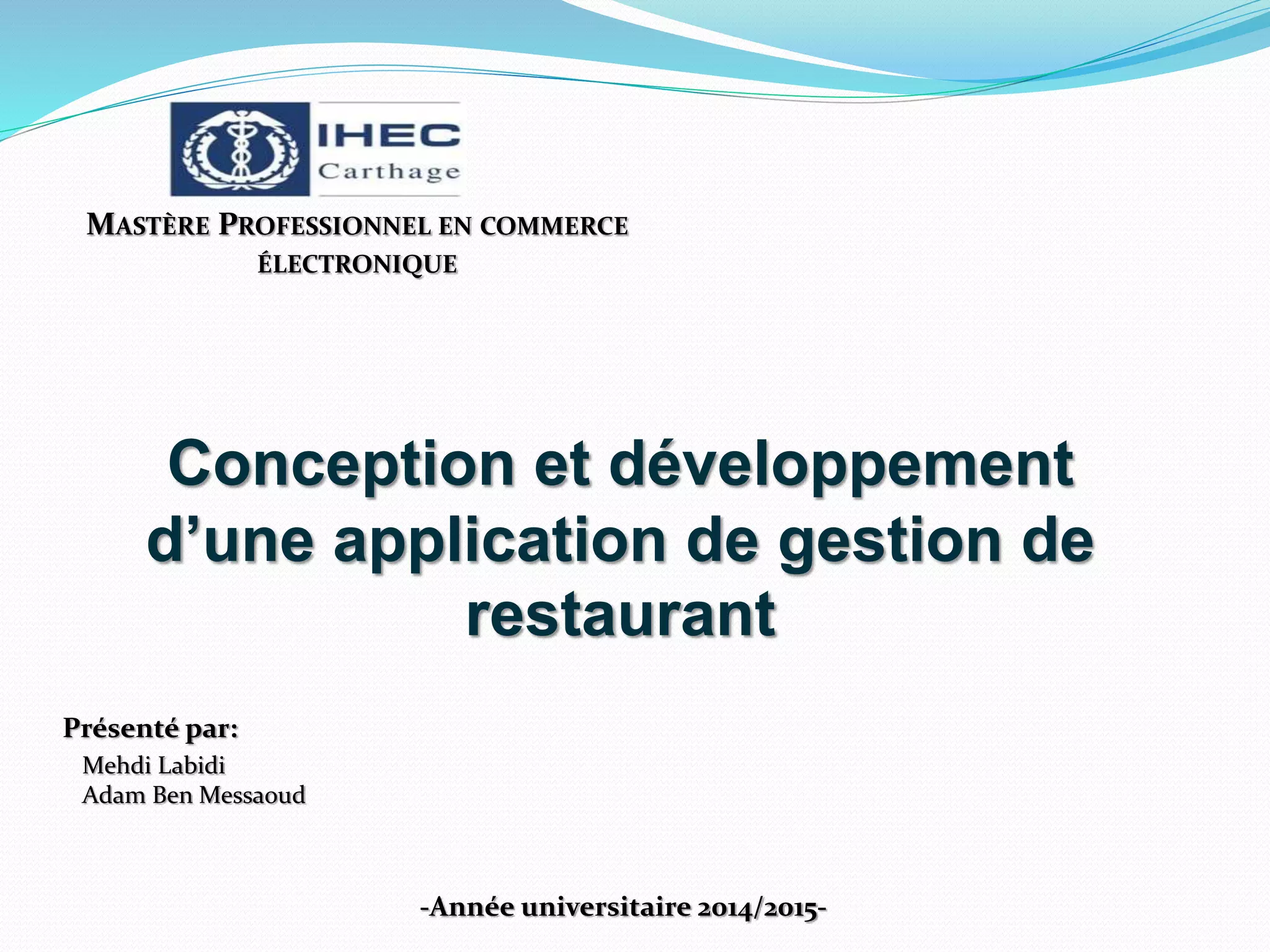 Ce document présente la conception et le développement d'une application de gestion de restaurant visant à faciliter les réservations et la gestion pour les administrateurs et les clients. Il souligne l'importance croissante des applications mobiles dans le secteur, ainsi que les fonctionnalités clés telles que la consultation des menus et la gestion des réservations. L'auteur prévoit d'améliorer l'application en intégrant un service de livraison à domicile.