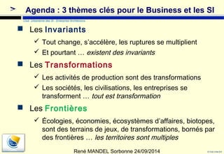 Le document traite de l'impact des transformations et des invariants dans les systèmes d'information et le business, en explorant les cycles et parcours au sein des réseaux de valeur. Il souligne l'importance d'aligner les évolutions technologiques et culturelles avec les objectifs stratégiques des entreprises. La complexité des systèmes modernes est mise en avant, notamment à travers des exemples concrets d'interactions entre différents acteurs et processus.