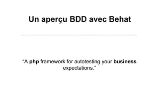 Le document présente une introduction à Behat, un framework PHP pour le développement dirigé par le comportement (BDD) et l'automatisation des tests. Il décrit l'anatomie de Behat, y compris les fonctionnalités, les scénarios, et le langage Gherkin, ainsi que des détails sur son installation et sa configuration. Enfin, il aborde les contextes, les filtres, les tags, et les hooks pour structurer et exécuter les tests de manière efficace.