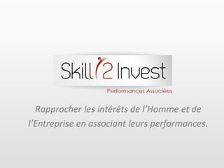 Skill2invest est un cabinet de conseil RH spécialisé dans le recrutement et l'accompagnement des entreprises tout au long de leur cycle de vie. Il propose des services de recherche d'associés, de financement et de développement de la performance, tout en facilitant les mises en relation entre talents et entreprises. La méthode utilisée permet de valider la performance des binômes de manière optimale.