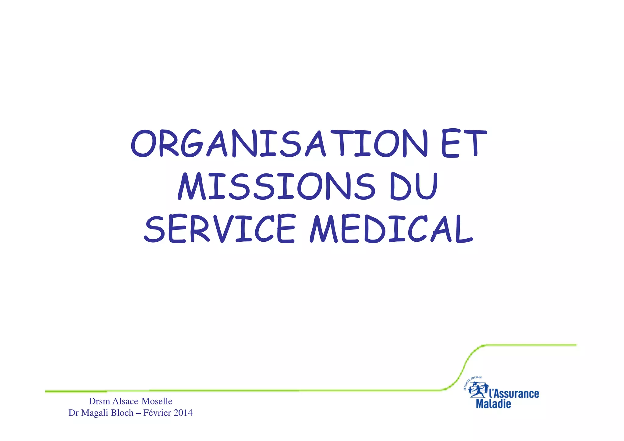 Le document présente l'organisation et les missions du service médical de l'Assurance Maladie en Alsace-Moselle, détaillant son historique, sa structure, et ses activités. Il souligne l'importance de la protection sociale en France et l'évolution des régimes d'assurance maladie ainsi que les objectifs de maîtrise médicalisée des dépenses de santé. Enfin, le document décrit les interactions entre le service médical, les professionnels de santé, et les assurés dans le cadre du système de santé français.