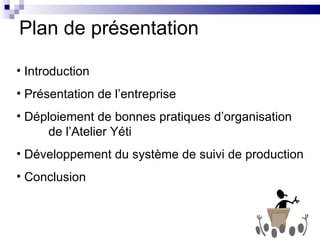 Le document présente la soutenance de stage d'ingénieur de Shurong Liu, qui a porté sur le déploiement de bonnes pratiques d'organisation à l'atelier Yéti et le développement d'un système de suivi de production chez Mont Blanc. Ce stage a permis d'améliorer l'efficacité de la production grâce à des outils visuels et une gestion moderne, tout en réalisant un investissement significatif pour l'entreprise. Les résultats comprennent une meilleure performance de l'atelier et une automatisation des traitements de données.