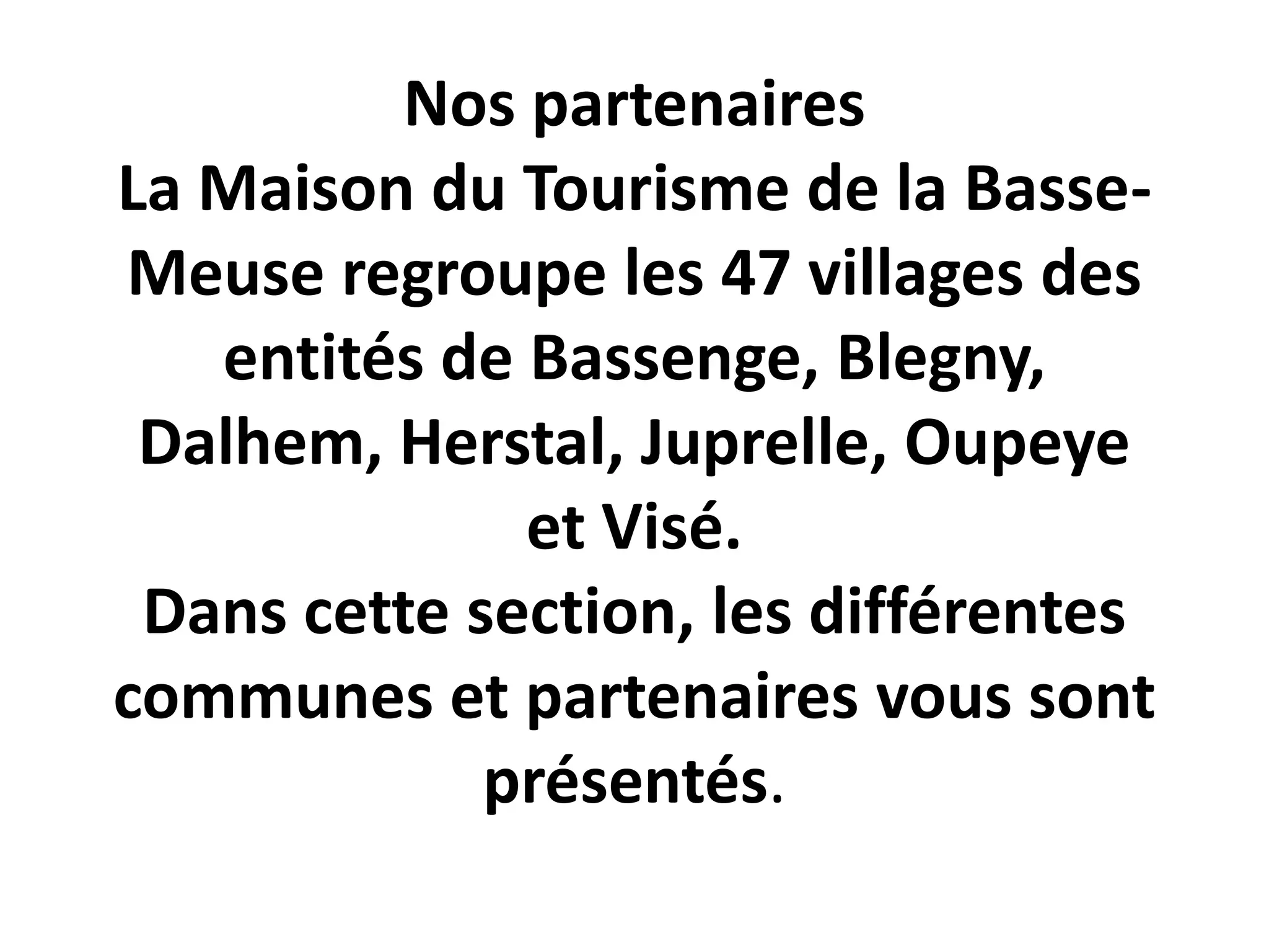 Le document présente la Maison du Tourisme de la Basse-Meuse, qui regroupe 47 villages dans plusieurs communes, notamment Bassenge, Blegny, Dalhem, Herstal, Juprelle, Oupeye et Visé. Chaque commune offre des attractions historiques, culturelles et naturelles, comme des musées, des fortifications, des paysages bucoliques et des festivals folkloriques. L'ensemble de la région est caractérisé par son riche patrimoine, sa variété d'activités de loisirs et son ambiance accueillante.