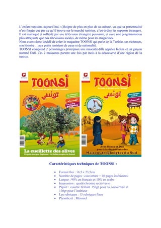 Le magazine Toonsi a été créé pour aider les enfants tunisiens à se reconnecter avec leur culture face à l'influence croissante des médias étrangers. Il présente deux mascottes, Kenza et Dali, qui explorent la Tunisie chaque mois et comprend divers rubriques éducatives et ludiques. Toonsi est conçu avec un format spécifique, un mélange de langues, et une périodicité mensuelle.