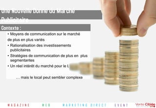 Le document présente des solutions marketing ciblées pour les points de vente, visant à optimiser la communication et la relation avec les clients pour générer du trafic. Il met l'accent sur l'importance d'une approche locale et personnalisée, notamment par le biais d'outils numériques et événementiels. L'objectif est de conquérir une clientèle à fort pouvoir d'achat et d'améliorer la fidélisation en utilisant différents canaux tels que le mailing, l'emailing et le marketing direct.