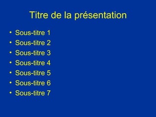 La présentation comprend plusieurs sous-titres qui introduisent différentes parties de contenu. Chaque sous-titre aborde un sujet spécifique dans le cadre de la présentation. L'organisation vise à structurer l'information de manière claire et accessible.