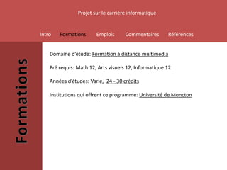 Le document présente un projet de carrière en informatique, décrivant plusieurs formations et opportunités d'emploi dans ce domaine. Il fournit des détails sur les programmes d'études, les salaires, et les tâches associées aux carrières de développeur multimédia, développeur de jeux vidéo, programmeur informatique, développeur web, et webmestre. L'auteur exprime son intérêt varié pour ces carrières, avec un désir particulier de devenir développeur de jeux vidéo.