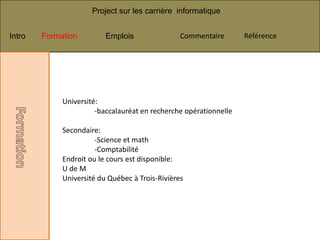 Le document présente divers métiers liés à l'informatique, leurs formations et les salaires associés, comme analyste en recherche opérationnelle et experts-conseils en informatique. Il mentionne également les préférences personnelles de l'auteur concernant son orientation professionnelle. Enfin, il référence plusieurs établissements d'enseignement supérieur où ces formations sont disponibles.