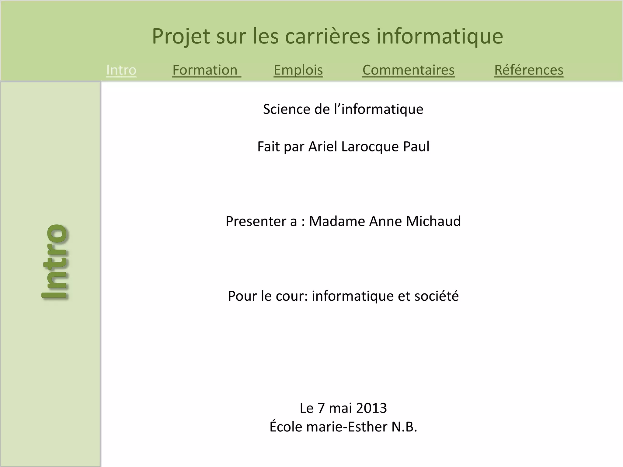 Le document présente un projet sur les carrières en informatique, incluant des informations sur les prérequis, les salaires et les intérêts personnels de l'auteur concernant plusieurs métiers. Les carrières discutées incluent webmestre, programmeur informatique, spécialiste en soutien informatique, formateur en informatique et informaticien, avec des salaires variables allant de 25 000 $ à 100 000 $. L'auteur exprime un désintérêt pour toutes les carrières examinées.