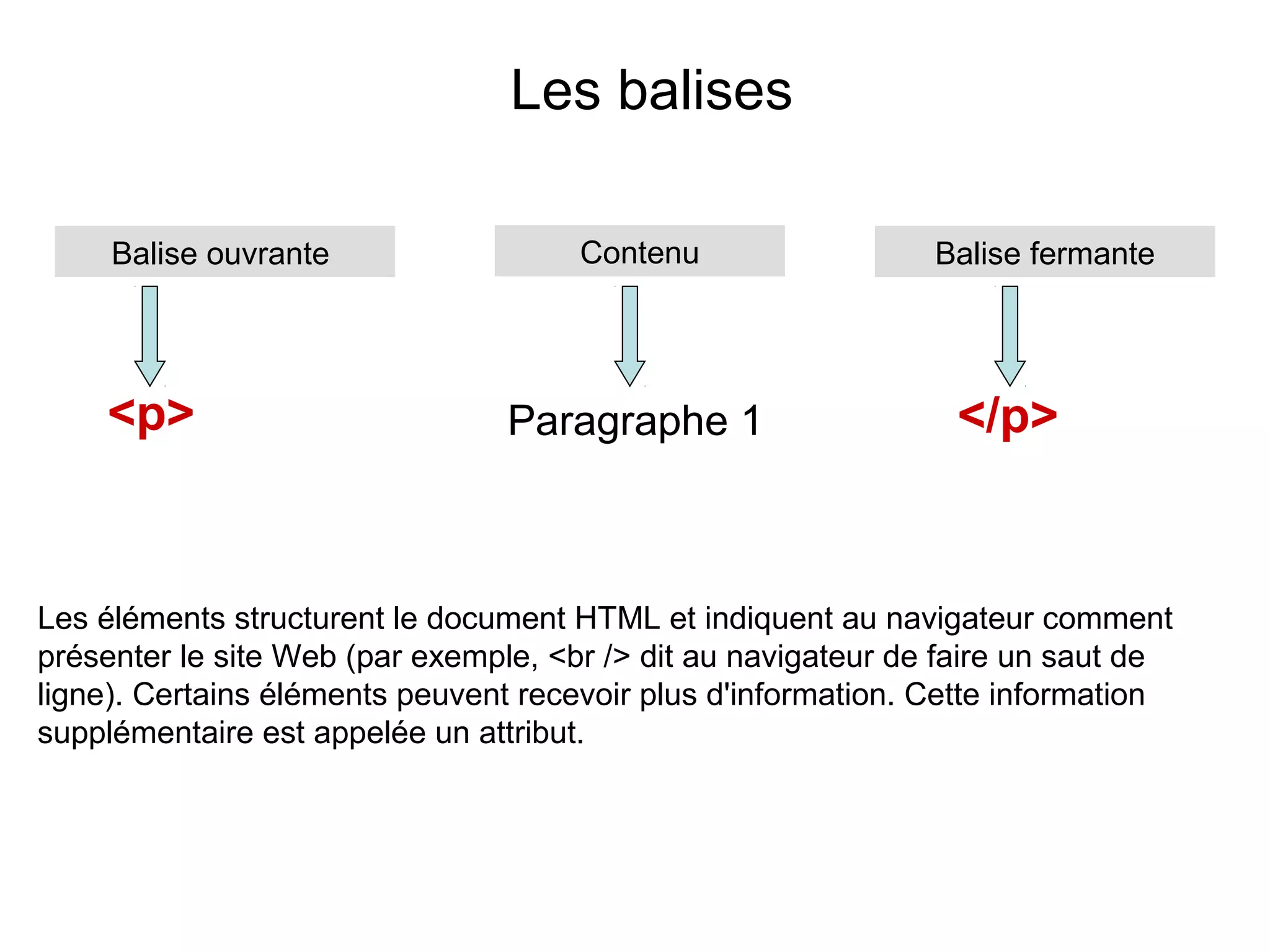Le document explique comment les balises HTML structurent un site web, en indiquant au navigateur comment afficher le contenu. Les éléments tels que <p>, <h2>, <a> et <img> sont présentés avec des attributs supplémentaires pour enrichir l'information. Les exemples illustrent les balises d'ouverture et de fermeture ainsi que leurs fonctionnalités respectives.
