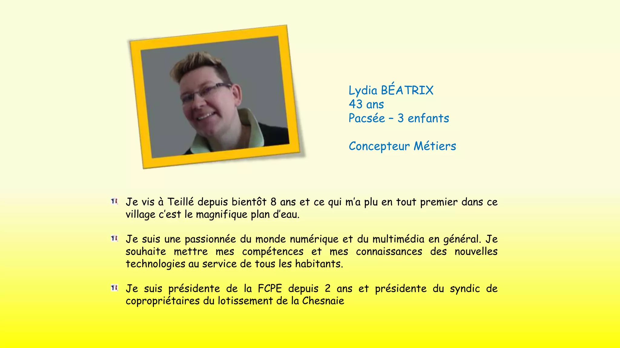 Le document présente les parcours et compétences de plusieurs habitants de Teillé, chacun ayant des expériences variées dans des domaines tels que l'éducation, la gestion, et les services sociaux. Il met en avant leur engagement communautaire, notamment à travers le bénévolat et des rôles dans des associations locales. Ces individus partagent un intérêt commun pour le développement technologique et le bien-être de leur commune.