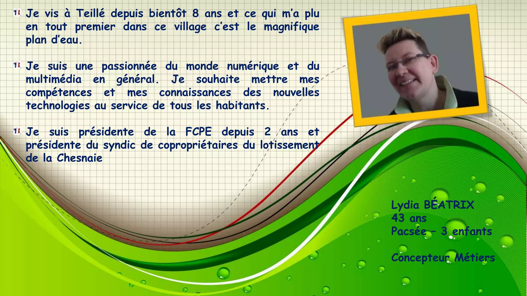 L'auteur, résident de Teillé depuis 8 ans et passionné par le numérique, met en avant son engagement local en tant que présidente de la FCPE et du syndic de copropriété. Il présente diverses contributions de membres de la communauté, incluant des bénévoles et des professionnels aux compétences variées. Le document décrit aussi leur implication dans des projets éducatifs et sociaux au sein du village.