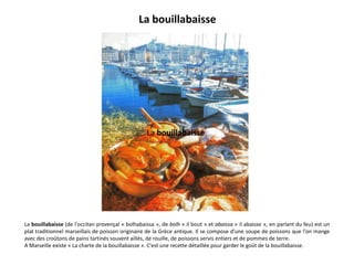 Le document présente des spécialités culinaires de la Provence, notamment la salade niçoise, qui est une entrée à base de crudités, et la bouillabaisse, une soupe de poissons traditionnelle marseillaise. Il mentionne également la recette d'une salade de fruits ainsi que des informations sur le pastis, une boisson alcoolisée à base d'anis. Ces plats illustrent la richesse gastronomique de la région.