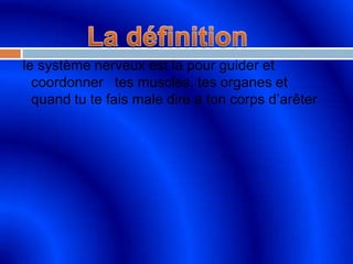Le système nerveux est essentiel pour guider et coordonner les muscles et organes, et il transmet des signaux de douleur au corps. Le cerveau est le principal organe du système nerveux central, tandis que la moelle épinière joue un rôle crucial dans cette communication. Le document mentionne également que les informations peuvent être trouvées en ligne via des images illustrant le système nerveux.