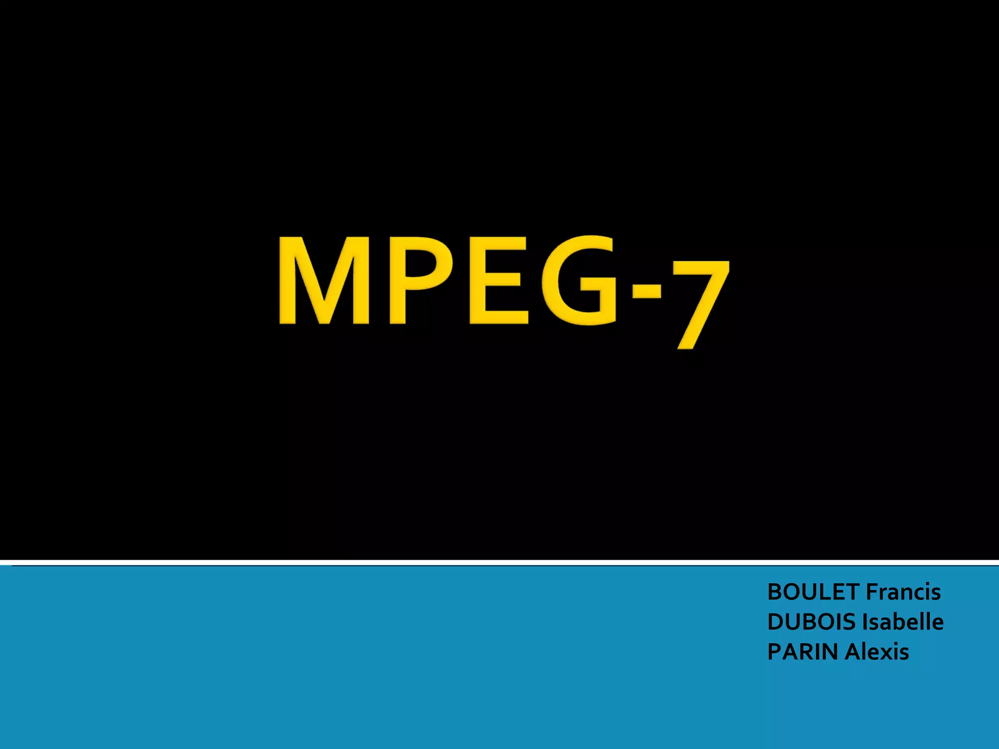 Le MPEG-7 est un standard d'encodage développé pour décrire le contenu multimédia, permettant une recherche et une gestion efficaces des données audiovisuelles. Il utilise des descripteurs et des schémas pour détailler la création, la production et les caractéristiques techniques du contenu. Sa flexibilité permet de créer de nouveaux descripteurs, ce qui aide à l'indexation, la recherche et d'autres applications multimédias.