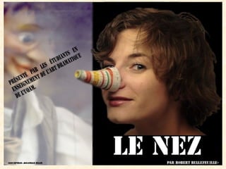La présentation de la pièce 'Le Nez' de Robert Bellefeuille explore une comédie inspirée de Gogol, où des personnages découvrent la perte de nez de façon absurde. La pièce, adaptée pour un jeune public, utilise des marionnettes et des chansons pour rendre l'expérience dynamique. Elle reste pertinente aujourd'hui par son humour et son approche théâtrale.