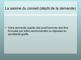 Le document décrit la procédure de saisine et de jugement au conseil des prud'hommes, incluant la nécessité de déposer une demande, le processus de conciliation et les modalités de jugement. Il souligne que si la conciliation échoue, l'affaire est renvoyée et jugée par des conseillers prud'homaux avec un recours possible selon le montant de la demande. Enfin, il précise les conditions et délais après le jugement.