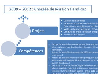 Le document couvre les activités d'une chargée de mission handicap de 2009 à 2012, comprenant des actions de formation et de sensibilisation, ainsi que la coordination de projets liés à l'accessibilité. Il mentionne également la mise en place d'un réseau de compétences et l'exécution d'un plan de soutien régional pour les bâtiments publics. Les qualités relationnelles et l'expertise technique sont mises en avant dans le cadre de ces missions.