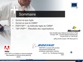 Le document traite de l'amélioration des processus de développement logiciel à travers l'application des méthodes agiles et du Capability Maturity Model Integration (CMMI). Il souligne l'importance de l'interaction humaine, de l'autonomie des équipes et de l'adaptabilité face au changement, tout en mentionnant des études de cas et des résultats positifs obtenus avec le Team Software Process (TSP) et le Personal Software Process (PSP). Des critiques et malentendus souvent associés à ces méthodes sont également abordés, ainsi que les compétences nécessaires pour les membres d'équipe.
