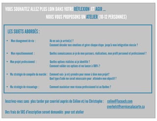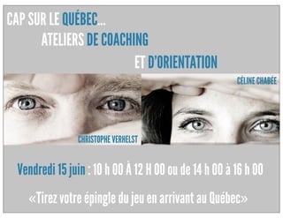 L'atelier de coaching proposé par Céline Chabée et Christophe Verhelst a lieu le 15 juin et aborde différents sujets liés à l'intégration au Québec. Destiné à 10-12 participants, il traite des changements de vie, du repositionnement professionnel et des stratégies de réseautage. L'inscription est de 50 $ et se fait par courriel.