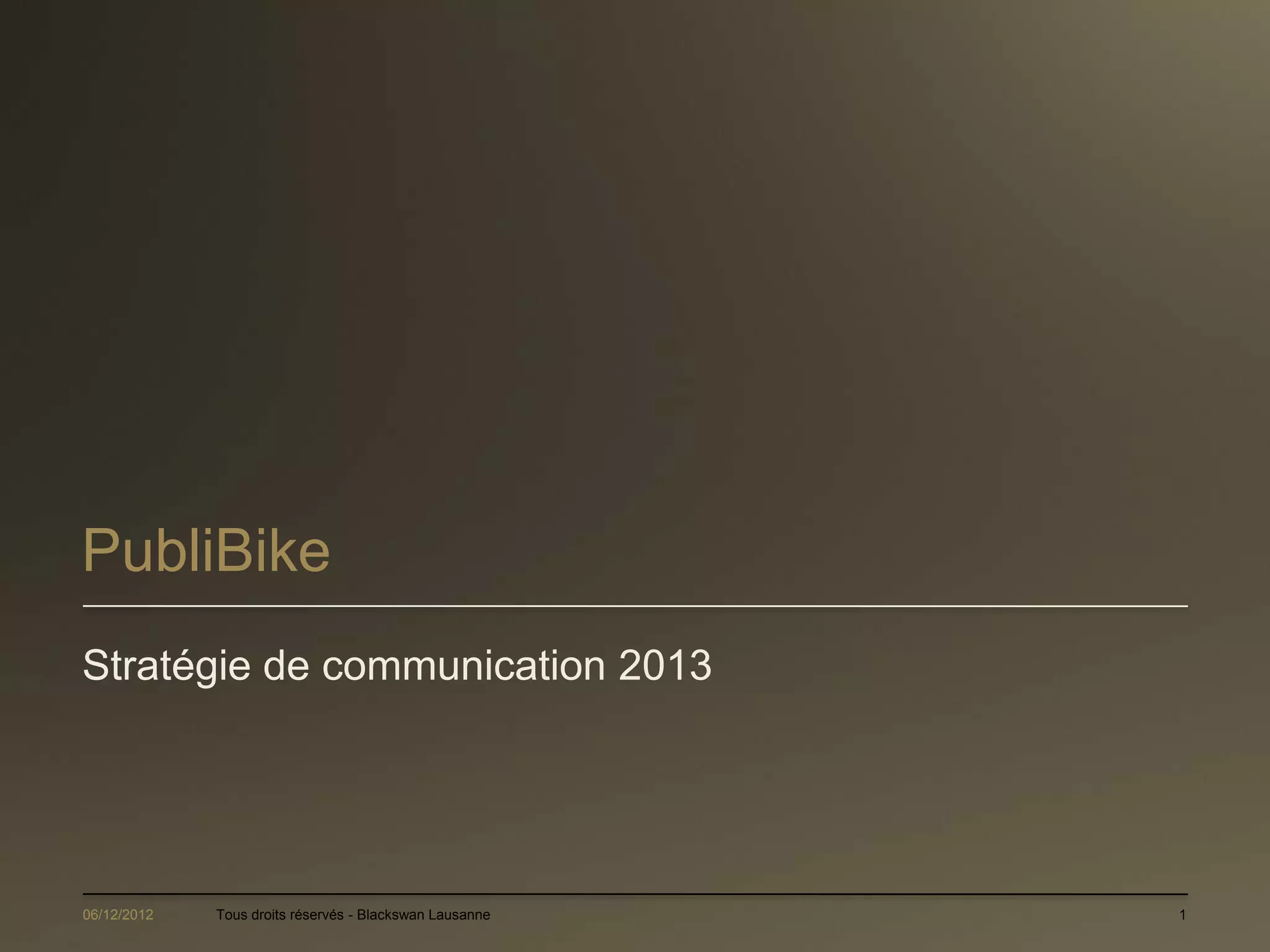 Le document présente la stratégie de communication de Publibike, soulignant l'importance de la marque et son positionnement dans le secteur des vélos en libre-service en Suisse. Il explore la vision actuelle et future de l'entreprise, en mettant l'accent sur la création de liens entre les villes et les usagers, ainsi que sur l'importance de l'innovation et de l'engagement communautaire. Publibike vise à renforcer sa notoriété et à établir une relation dynamique avec ses utilisateurs à travers une approche de communication ciblée et une interaction améliorée.