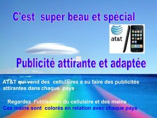 Le document met en avant des publicités attractives créées par AT&T pour promouvoir ses cellulaires dans divers pays. Chaque publicité utilise des mains colorées pour établir une connexion culturelle avec le pays visé. Ces campagnes sont décrites comme belles et spéciales.