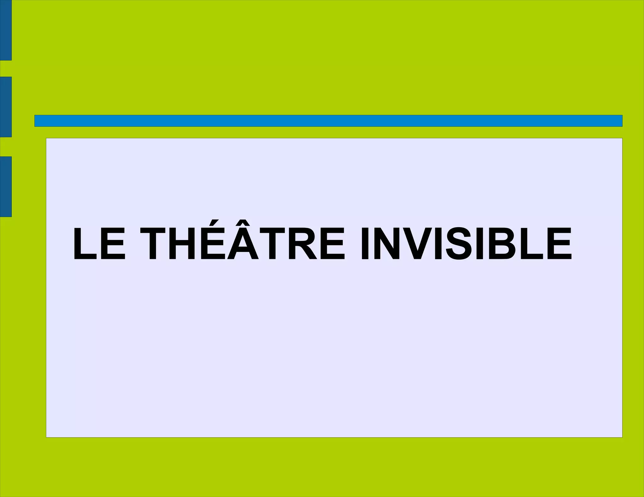 Le document présente le concept de théâtre invisible d'Augusto Boal, visant à libérer les individus de leurs oppressions à travers des techniques inspirées du théâtre de l'opprimé. Il évoque divers ouvrages de Boal et met en avant des exemples pratiques illustrant comment cette forme de théâtre peut dynamiser le sentiment d'oppression. Le théâtre invisible vise à faire passer les spectateurs d'un rôle passif à un rôle actif, favorisant ainsi la solidarité et la conscience sociale.