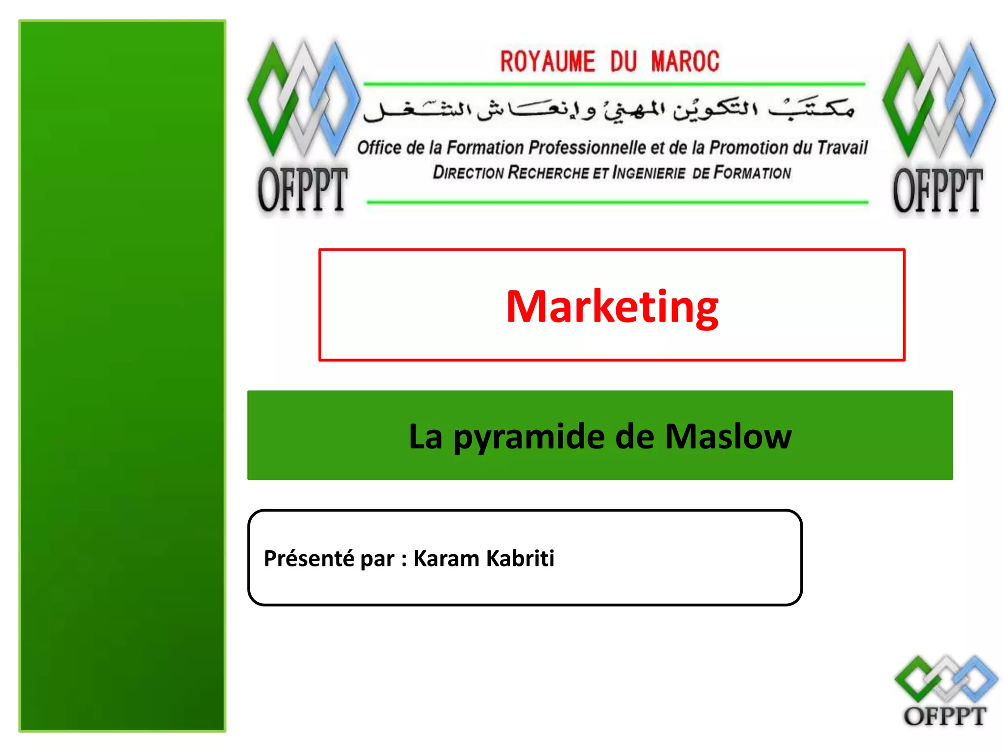 La pyramide de Maslow, créée par Abraham Maslow, classe les besoins humains en cinq niveaux hiérarchiques, allant des besoins physiologiques aux besoins d'auto-actualisation. Elle est utilisée dans le marketing pour positionner des produits en fonction des besoins des consommateurs, et dans le management pour comprendre le comportement humain et vérifier la satisfaction des besoins fondamentaux. Bien que largement acceptée, cette théorie peut ne pas s'appliquer universellement, car elle a été développée à partir d'observations d'une population occidentale instruite.