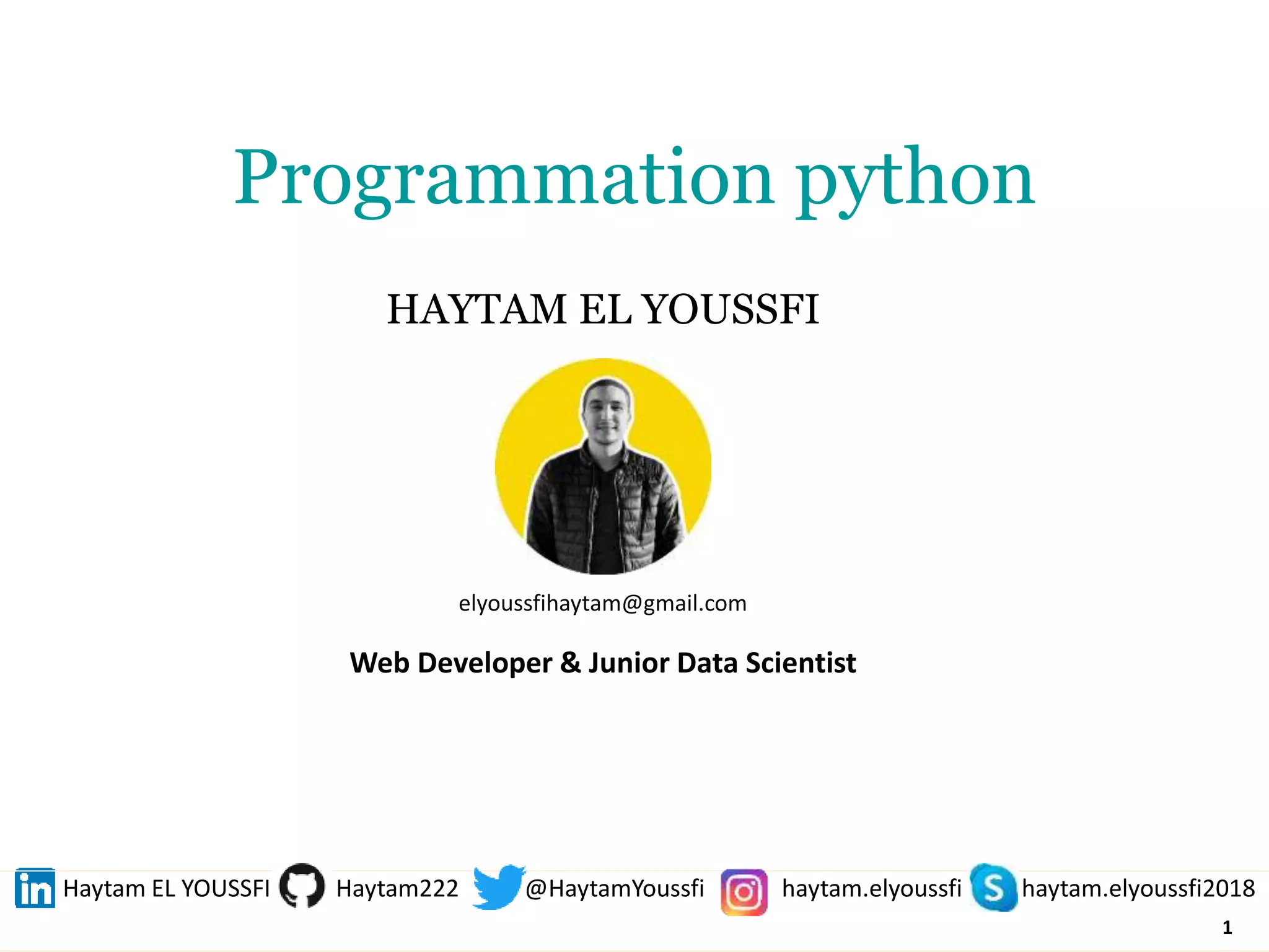 Ce document présente un cours de programmation Python, couvrant des sujets tels que l'introduction au langage, les structures de contrôle, les conteneurs standards, et les opérations de base. Il décrit également des spécificités du langage, comme la syntaxe, les fonctions, et les types de données, tout en fournissant des exemples pratiques. Enfin, il met l'accent sur des concepts clés comme la manipulation des listes, la gestion des strings, et la programmation orientée objet.