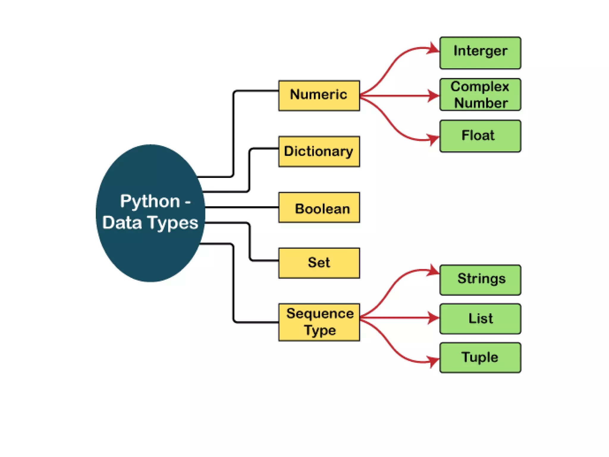 Different types of data in Python such as numbers, strings, booleans, lists, sets, and dictionaries.