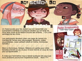 Le week-end à la bibliothèque d'Intra-Muros a été marqué par des activités autour des 'Carnets de Cerise' avec une exposition, des ateliers de scrapbooking et une rencontre avec les auteurs Joris Chamblain et Aurélie Neyret. Les ateliers ont réuni une quarantaine d'enfants et quelques adultes, et la rencontre avec les auteurs a attiré une trentaine de fans. L'exposition est disponible jusqu'au 22 novembre pour le public.
