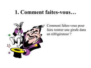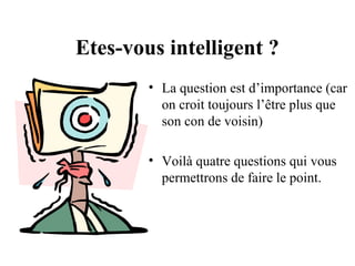 Le document propose une série de questions ludiques pour évaluer l'intelligence et la capacité de réflexion des lecteurs. Il utilise des situations absurdes impliquant une girafe, un éléphant et un réfrigérateur pour tester l'abstraction et la réflexion critique. À travers l'humour, il conclut que la compréhension de ces énigmes révèle une forme d'intelligence et invite à partager l'histoire avec d'autres.