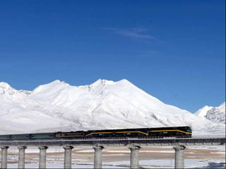Le document traite de la construction du chemin de fer Qinghai-Tibet, le plus haut du monde, reliant Pékin à Lhassa, malgré les immenses défis géographiques et environnementaux. Il décrit les solutions techniques mises en place pour surmonter les obstacles, ainsi que l'importance de la protection de l'écosystème fragile de la région tibétaine. Le projet représente un investissement significatif pour améliorer l'infrastructure et soutenir l'économie du Tibet, une province isolée de la Chine.
