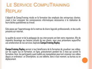Computraining a développé un service appelé 'computraining replay' permettant aux employés formés de revoir gratuitement les vidéos des formations pendant trois mois. Pour faciliter l'accès à ce service, des cartes de visite équipées de QR codes seront fournies aux agents commerciaux, permettant aux clients de scanner et d'accéder facilement aux vidéos en ligne. Cette initiative vise à renforcer l'apprentissage durable et à convaincre les grandes entreprises de continuer à faire appel à leurs services.
