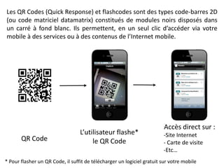 Les QR codes sont des codes-barres 2D permettant un accès rapide à des contenus en ligne via un mobile, offrant des fonctionnalités variées comme la navigation web, le stockage de contacts ou l'envoi de messages. Avec une capacité de stockage supérieure à celle des codes-barres traditionnels, ils sont de plus en plus utilisés, notamment en France. Leur facilité d'utilisation et de création contribue à leur popularité croissante dans le marketing mobile.
