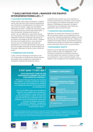 Le document traite de la gestion d'équipes intergénérationnelles en Bretagne, en soulignant l'importance de la compréhension mutuelle et du tutorat pour le transfert de compétences. Il décrit également des stratégies pour favoriser la coopération entre les générations, comme la création d'une culture d'entreprise inclusive et l'adaptation des méthodes de management. En présentant des témoignages d'entreprises, le texte met en exergue les défis et les bénéfices liés à la diversité des âges au sein des équipes.