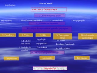 Le document présente une analyse approfondie du quartier de la marine à Alger, abordant la morphologie urbaine et la typologie des tissus urbains. Il examine les systèmes parcellaire et viaire, l'accessibilité, et l'impact des travaux de réaménagement sur l'image maritime de la ville. L'étude souligne les transformations historiques et les enjeux actuels pour assurer une meilleure relation entre la ville et le front de mer.