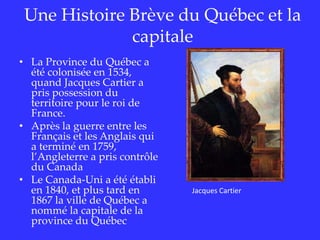 La ville de Québec, capitale de la province, a été colonisée en 1534 par Jacques Cartier. La région est principalement francophone, conservant ses traditions et son autonomie après le contrôle britannique. Québec offre de nombreuses attractions historiques comme la cathédrale Notre-Dame et le Château Frontenac.