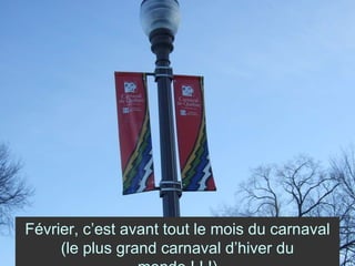 Le document décrit les activités et l'ambiance du carnaval d'hiver de Québec en février, mettant en avant des attractions comme les sculptures sur neige et le bar de glace. Il évoque également des traditions comme le 'bain de neige' et des événements musicaux, tout en mentionnant les conditions météorologiques changeantes. Enfin, un retour sur des souvenirs de la période hivernale et des interactions avec des colocataires est partagé.
