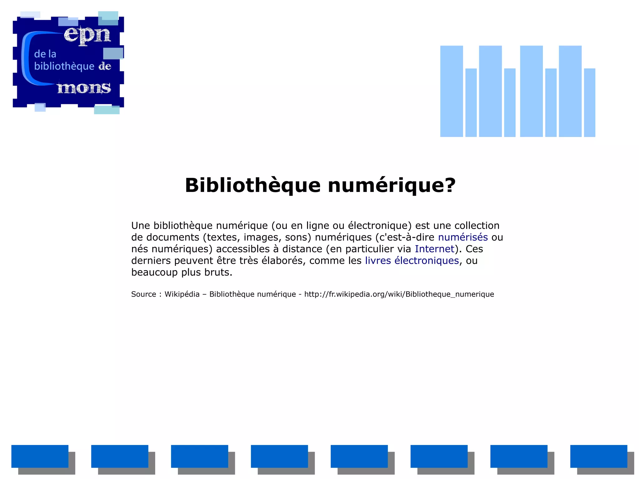 Une bibliothèque numérique est une collection de documents numériques accessibles en ligne, comprenant des textes, images et sons, comme des livres électroniques. Diverses ressources et projets, tels que Europeana et la Bibliothèque mondiale, visent à rendre le patrimoine culturel accessible au public. De nombreux services en ligne et réseaux sociaux, comme Babelio et Google Livres, facilitent la recherche et le partage d'œuvres littéraires.