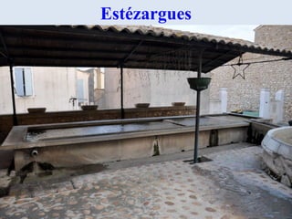 Le document présente une exploration des lavoirs situés dans le Gard, connus pour leur diversité architecturale. Il mentionne plusieurs localités où ces lavoirs peuvent être trouvés, comme Estézargues, Goudargues et Pont du Gard. Des diapos et photos illustrent ces lieux pittoresques au sein de cette région riche en patrimoine.