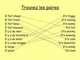 Le document se concentre sur les expressions et le vocabulaire liés aux conditions météorologiques en français et en anglais. Il met en avant des phrases pour décrire le temps et des activités associées, ainsi que des exercices de traduction. L'objectif principal est d'apprendre à utiliser le vocabulaire du temps dans des contextes variés.