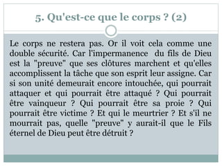 Le corps est perçu comme une clôture imaginée par le fils de Dieu pour séparer différentes parties de son soi, créant une illusion de sécurité. Bien qu'il soit considéré comme éphémère et destiné à la peur, le corps peut aussi servir de moyen de guérison de l'esprit lorsque son but est redéfini en lien avec l'amour. L'identification à l'amour, et non à la peur, est présentée comme la véritable source de sécurité et d'identité.