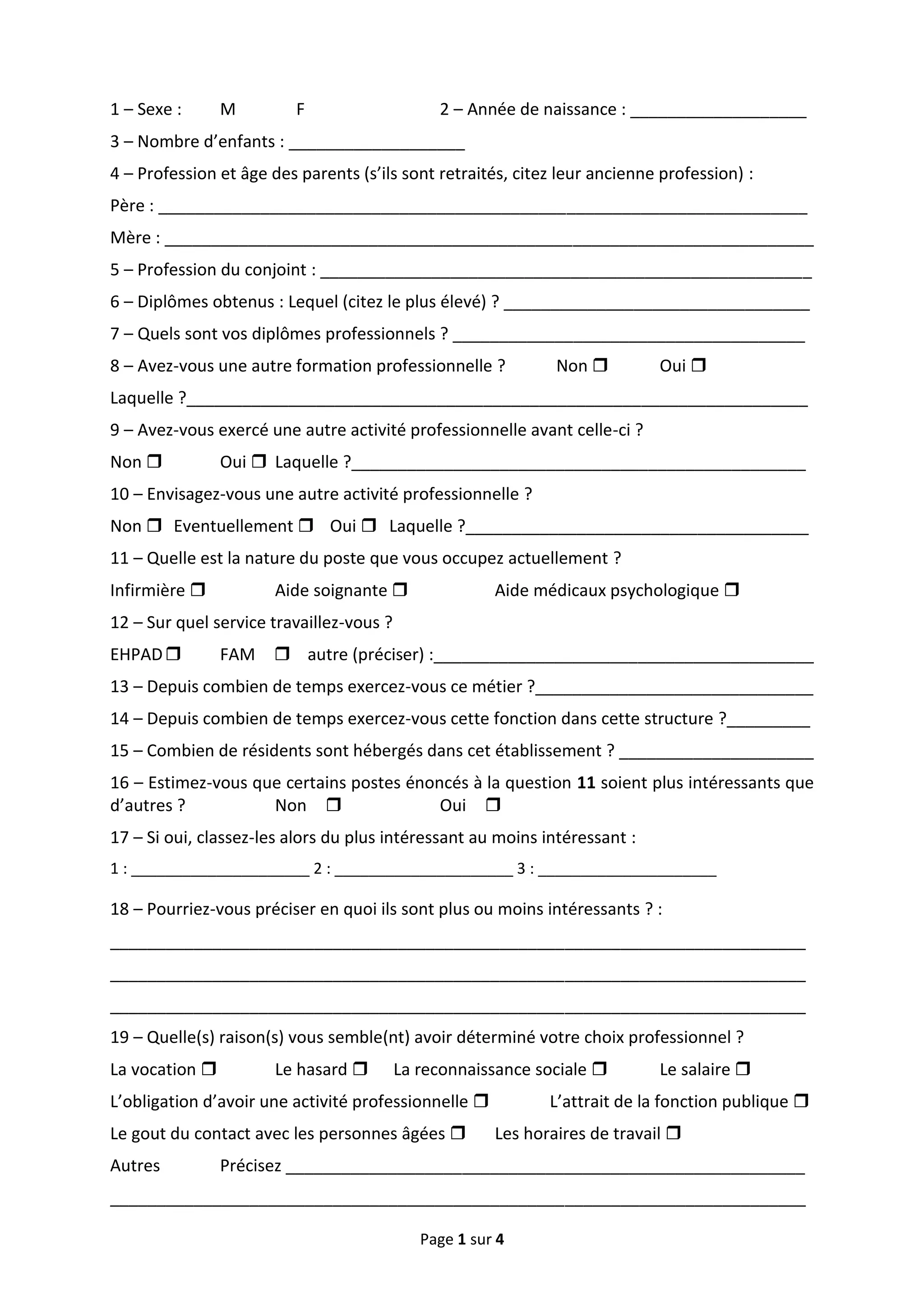 Le document est un questionnaire destiné à recueillir des informations sur la profession des participants, notamment leur âge, leur formation, leur état de satisfaction au travail, et leur perception de diverses dimensions du métier en maison de retraite. Il inclut également des questions sur l'histoire professionnelle, les raisons du choix de ce métier, ainsi que des réflexions sur les missions des infirmiers et aides-soignants. Enfin, le questionnaire se termine par une demande de remarques et suggestions de la part des participants.
