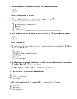Le document est un questionnaire auto-administré pour recueillir des informations sur les préférences et comportements des potentiels clients de l'école de danse de Québec. Il aborde des sujets tels que l'âge, le sexe, les moyens de recherche d'informations, ainsi que des critères d'achat et de publicité. L'objectif est de comprendre les attentes des participants vis-à-vis des cours de danse et des moyens de communication utilisés.