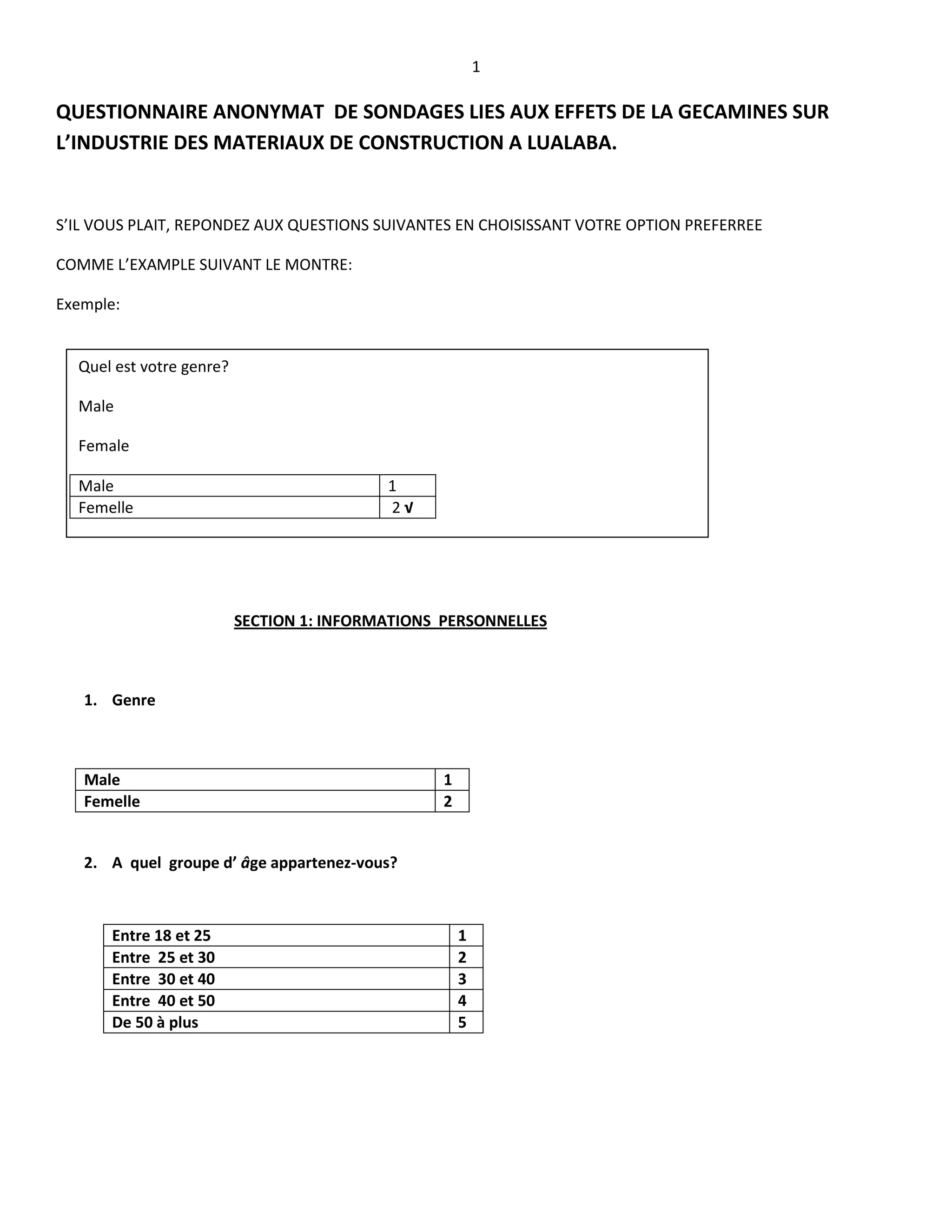 Le document est un questionnaire anonyme destiné à recueillir des opinions sur les effets de Gécamines sur l'industrie des matériaux de construction à Lualaba. Il comprend des questions sur des informations personnelles, l'impact socio-économique de Gécamines, et les attentes de la communauté concernant des réparations. Les répondants sont encouragés à répondre honnêtement, et leurs réponses resteront anonymes.