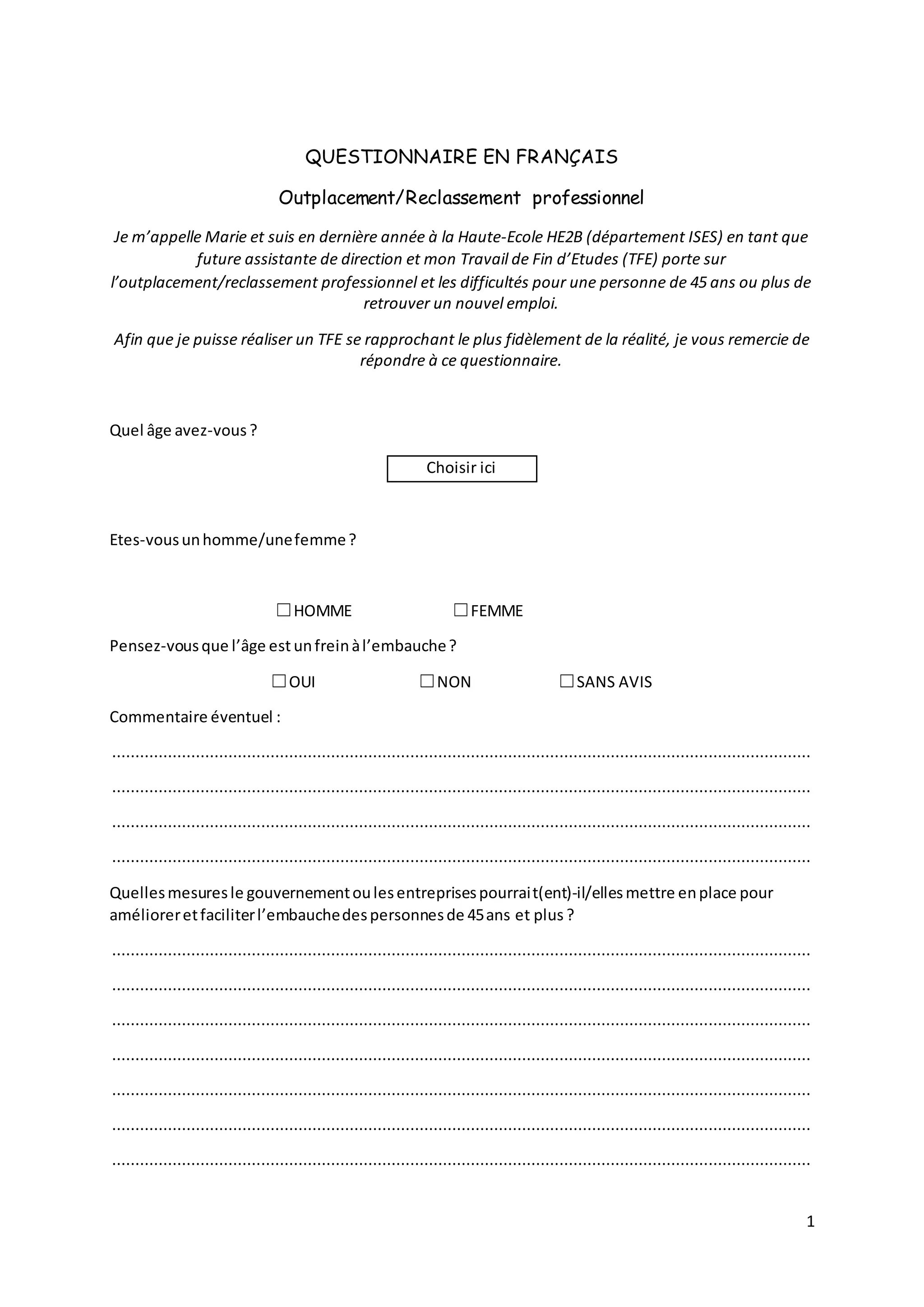 Ce document est un questionnaire destiné à recueillir des données sur l'outplacement et le reclassement professionnel, en particulier pour les travailleurs de 45 ans et plus. Il vise à identifier les freins à l'embauche et le degré de satisfaction des participants concernant les programmes d'outplacement. Les réponses aideront à la recherche de Marie, une étudiante en dernière année, pour son travail de fin d'études.