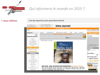 Le document explore les enjeux de l'information en 2015, mettant en lumière les logiques informationnelles et les nouveaux médiateurs à l'ère du web. Il aborde la redocumentarisation et la nécessité de métadonnées pour le traitement des documents, ainsi que l'importance des moteurs et agrégateurs dans la personnalisation et l'indexation de l'information. Les questions de confiance, d'authentification et d'écosystèmes web sont également soulevées en lien avec les identités numériques.