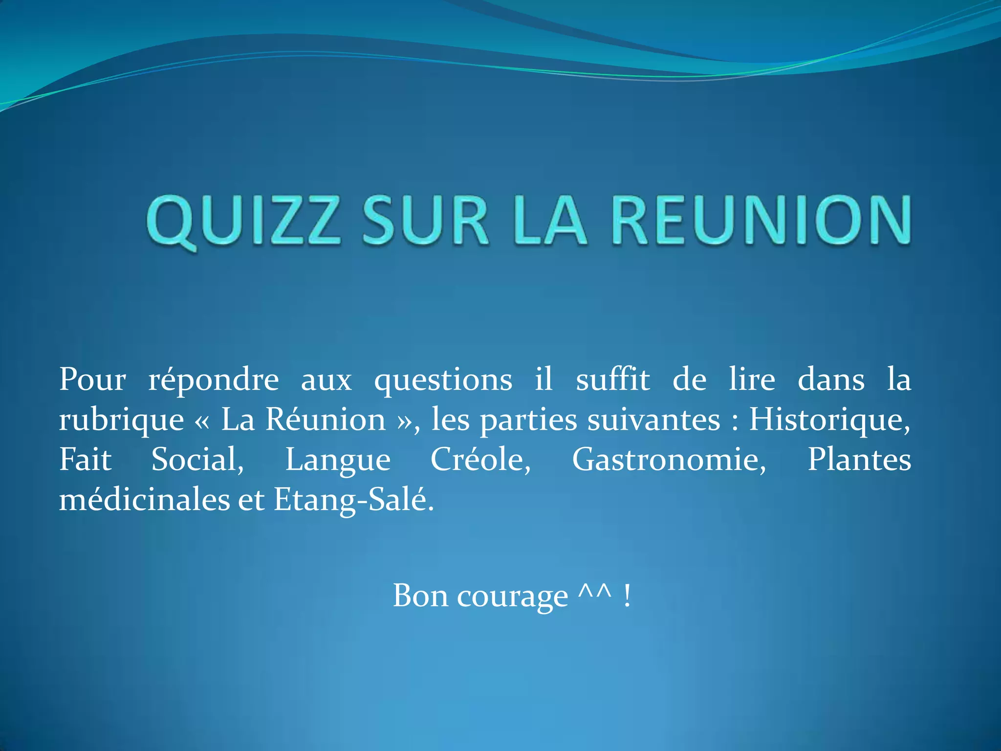 Le document présente des questions sur l'histoire, le fait social, la langue créole, la gastronomie, les plantes médicinales et la plage de l'étang-salé de La Réunion. Les réponses requises peuvent être de type vrai ou faux, ou nécessiter des compléments d'information. Il sert de guide pour mieux comprendre la culture et les spécificités de l'île.